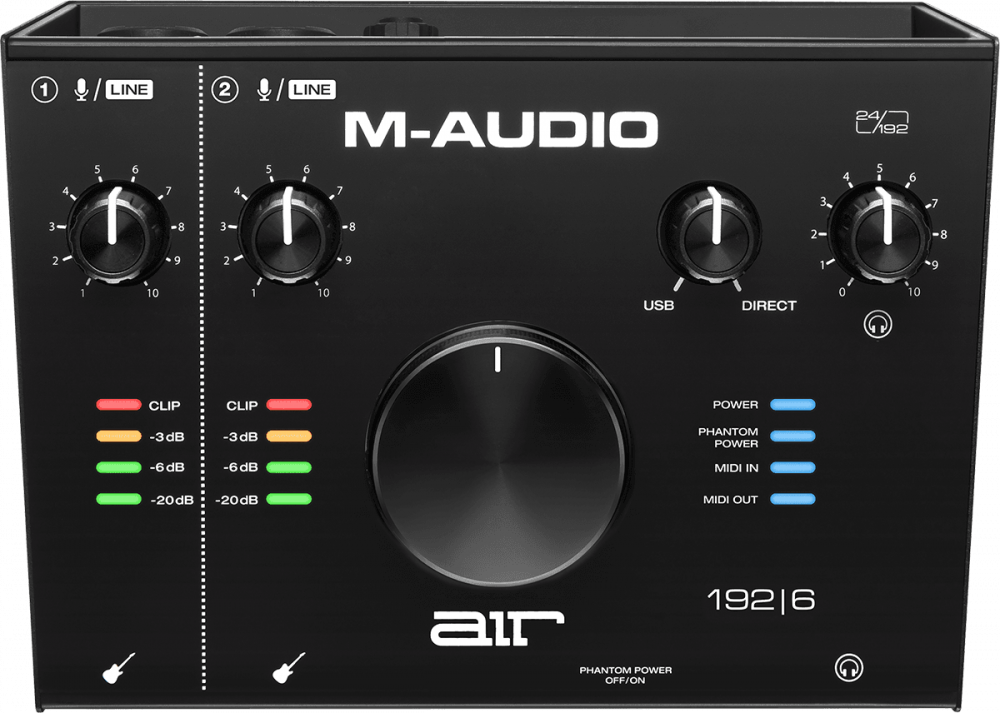 L'AIR 192 | 6 permet d'enregistrer avec une résolution audio allant jusqu'à 24 bits / 192 kHz, la même qualité que l'on retrouve dans de nombreux studios professionnels. Elle dispose de deux entrées combo XLR/TRS polyvalentes à l'arrière pour microphones et signaux ligne, ainsi que de deux entrées instrument TRS en façade, idéales pour brancher des guitares ou des basses directement. Les préamplis Crystal exclusifs de M-Audio, avec leurs réglages de gain individuels et leurs vumètres à LED, garantissent un son transparent et de haute qualité. Le potentiomètre de balance mix USB / direct offre un contrôle précis pour un monitoring sans latence de vos enregistrements. Une sortie casque avec contrôle de niveau indépendant permet une écoute privée immersive. De plus, l'entrée et la sortie MIDI 5 broches offrent une connectivité flexible pour vos équipements MIDI externes.